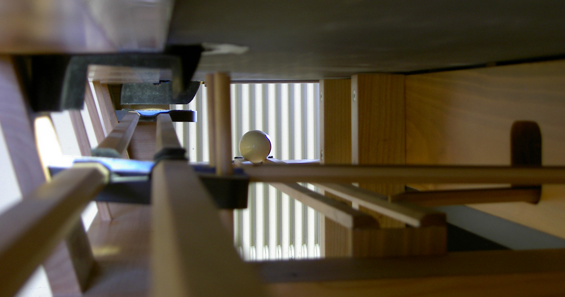 Die wirkliche Besonderheit aber liegt im Unterbau: Kugellaufbahnen lassen alle Kugeln von außen sichtbar in eine Schublade zusammenlaufen. Dank magnetischer Trennung wird die weiße Kugel separat aufgefangen.